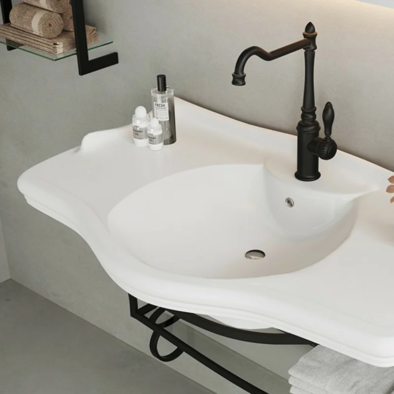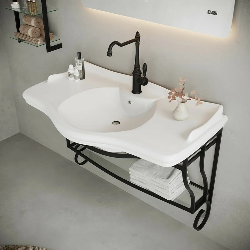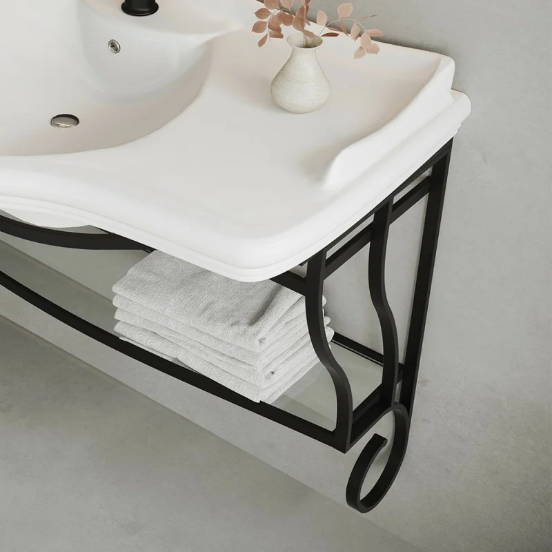 Il lavabo è realizzato in ceramica di primissima scelta,completo di foro per miscelatore e troppo pieno,dotato di ampi spazi ai lati della vasca,utili per poggiare complementi d’arredo. Il lavabo è sorretto da una struttura sospesa,in metallo con finitura nero opaco,perfezionata da un comodo ripiano portasciugamani e porta oggetti.