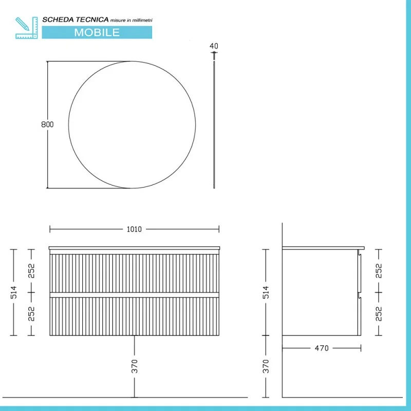 Mobile sottolavabo con due cassetti soft-close,vasca integrata in ceramica e specchio tondo 80 cm