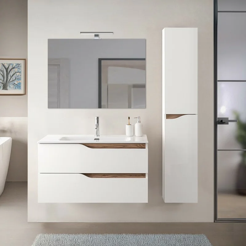 Composizione bagno sospesa da 100 cm in legno MDF bianco e quercia completa di mobile,lavabo da incasso in ceramica,specchiera a filo lucido e colonna bagno con apertura a destra linea Sumya