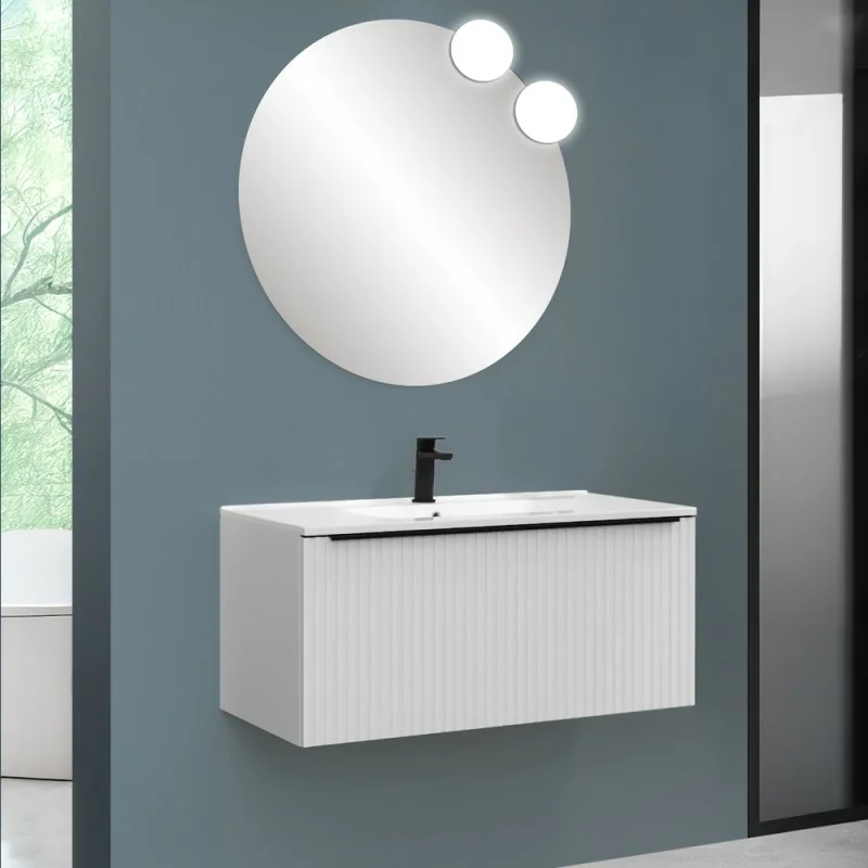 Mobile da bagno sospeso 100 cm bianco opaco cannettato con cassetto con maniglia a chiusura rallentata, specchio tondo da ⌀80 cm e lavabo in ceramica Nara