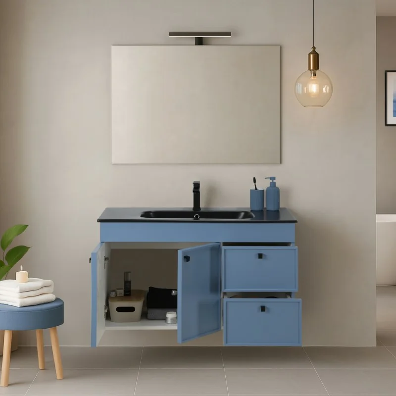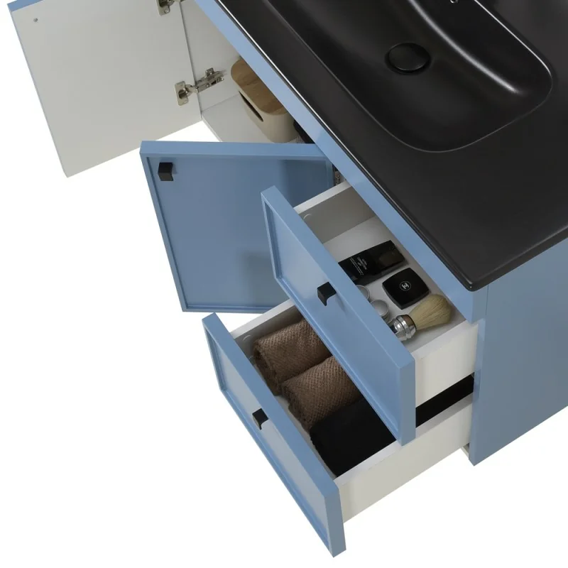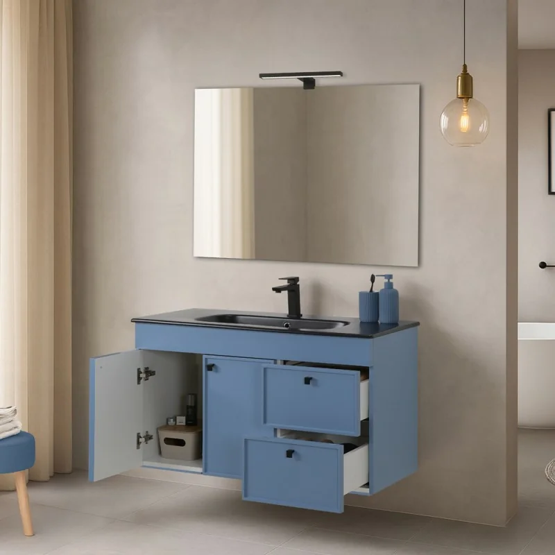 Mobile sospeso da bagno 100cm con ante e cassetti azzurro opaco incluso di specchio e lavabo Linea Craft