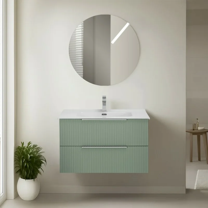 Mobile da bagno sospeso con cassetti verde cannettato 100 cm con lavabo e specchio tondo – Linea Zena