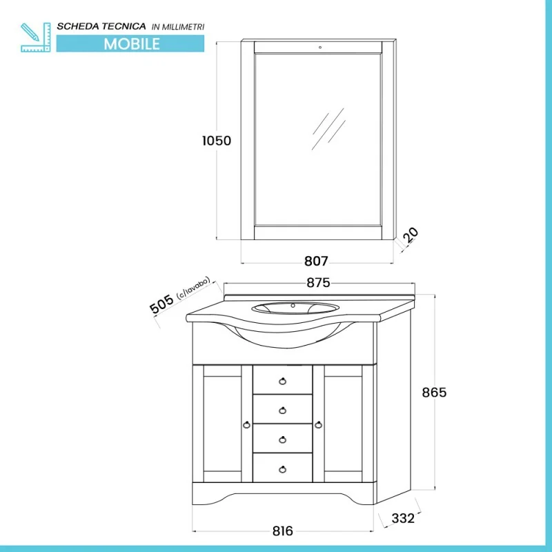 • Dimensioni mobile:L 81,6 x p 33,2 x H 86,5 cm;