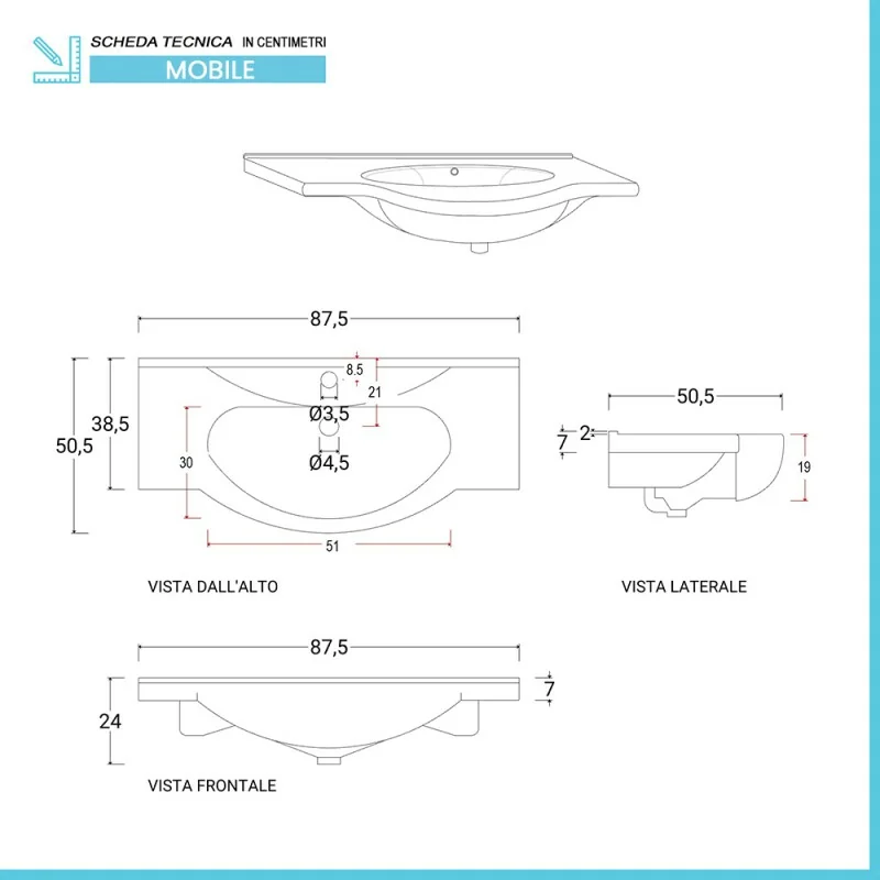 • Dimensioni lavabo:L 87,5 x p 50,5 x H 24 cm;