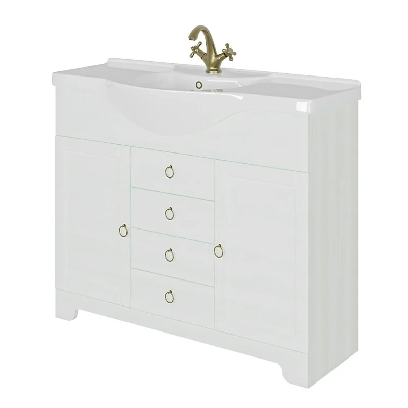 Romantica è l’arredo bagno dal design elegante e retrò,ideale per ambienti con stile classico in arte povera che non rinunciano alla comodità. Il mobile bagno da terra è realizzato in legno con ante in MDF e finitura bianco decape.