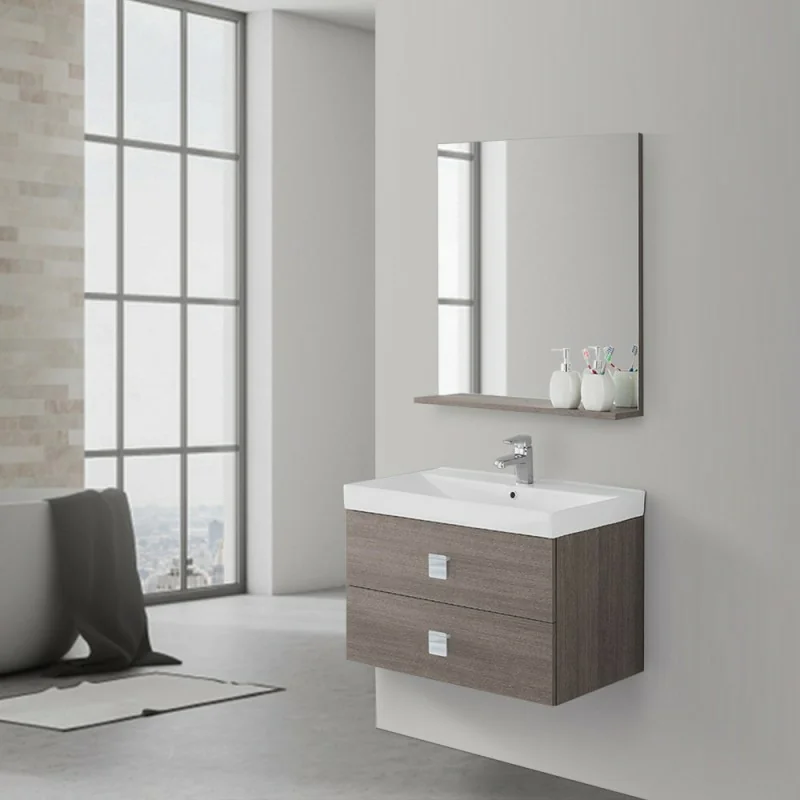 Il Mobile Bagno Sospeso con finitura Rovere Scuro si presenta come la soluzione ottimale per chi ama il design moderno ma non possiede ampie stanze. Il Mobile Moderno da Bagno è completo di Lavabo in Ceramica bianca e specchio su pannello con mensola,comoda per avere sempre a portata di mano quei prodotti che giornalmente utilizziamo per la pulizia.