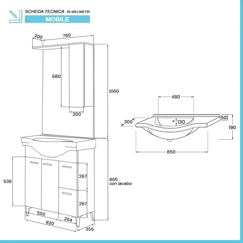 Mobile bagno a terra 85 cm caratteristiche tecniche: