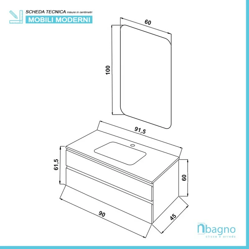• Dimensioni mobile: L90 x P 47 x H 60 cm