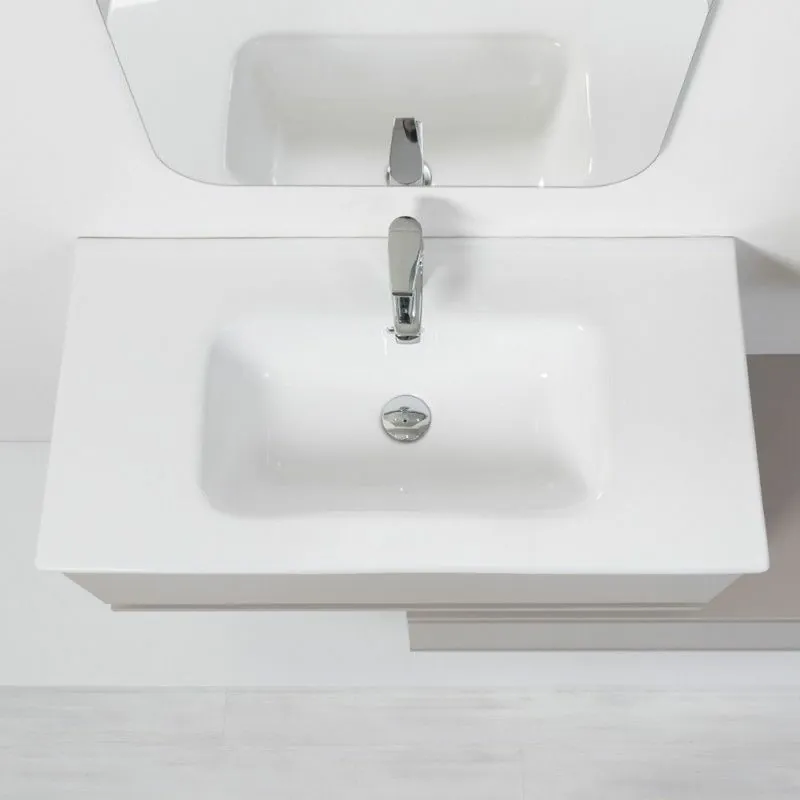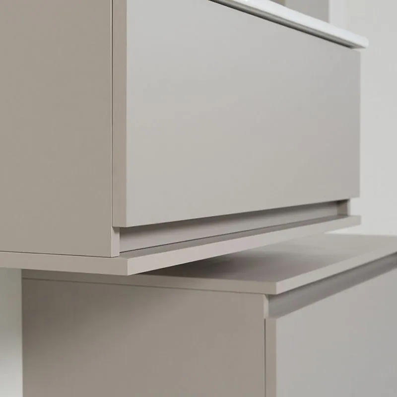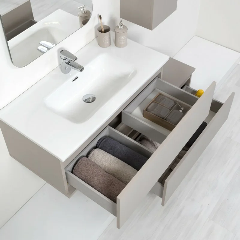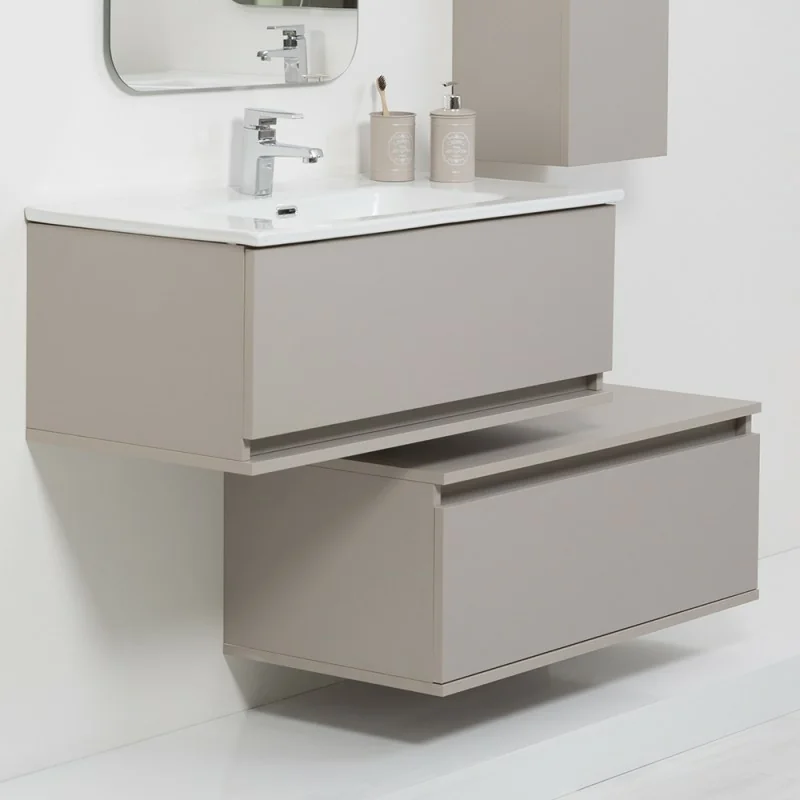 Mobile bagno sfalsato sospeso in finitura tortora con cassetti a chiusura ammortizzata soft close completo di lavabo in ceramica e specchio 60x100 cm