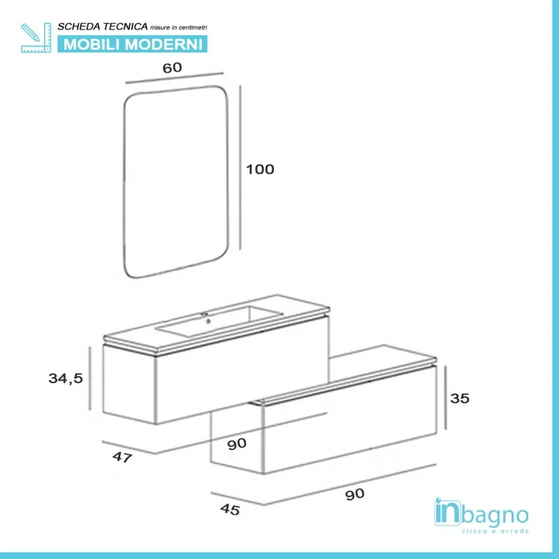 • Dimensioni mobile: L 90 x P 47 x H 35 cm