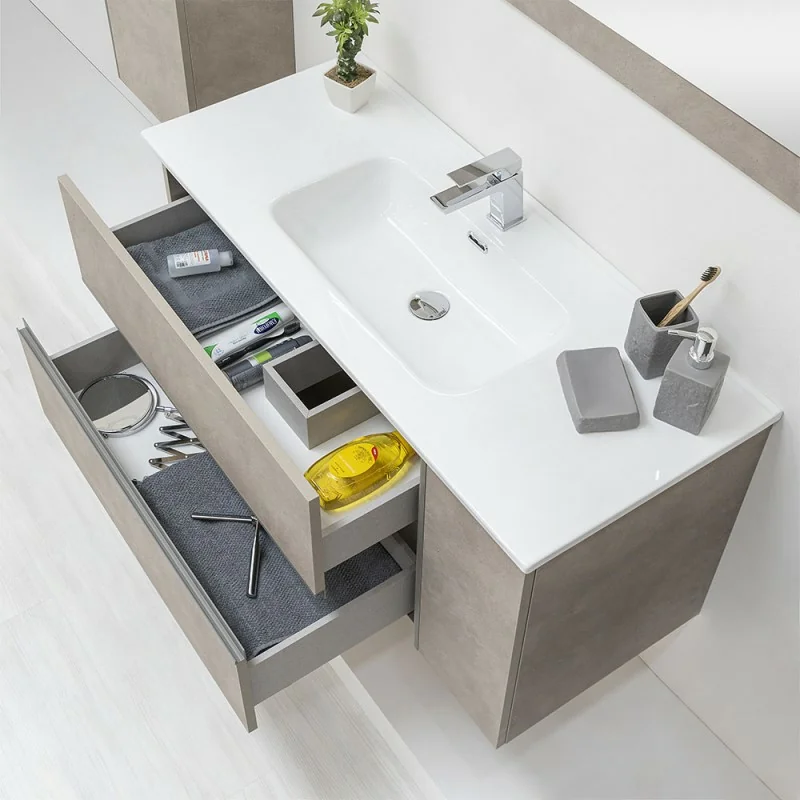 Mobile Bagno Effetto Pietra Beige  da 90 cm Sospeso Mobile bagno sospeso effetto pietra beige da 90 cm con lavabo e specchio inclusi Dettaglio cassetti del lavabo con mobile sospeso 90 cm effetto pietra beige Scheda tecnica mobile bagno effetto eietra beige da 90 cm sospeso Ante rallentate del mobile da bagno sospeso 90 cm effetto pietra beige Arredo bagno sospeso 90 cm effetto pietra beige con lavandino in ceramica bianca lucida e specchio a parete Cassettoni con chiusura rallentata soft close del mobile per bagno sospeso 90 cm effetto pietra beige Mobile da bagno salvaspazio 90 cm effetto pietra beige con lavabo e specchio inclusi