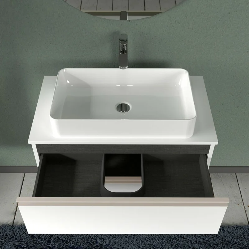 Mobile bagno sospeso da 80 cm con top in legno per l'installazione di lavabi d'appoggio. Questa composizione bagno è perfetta per il tuo ambiente bagno, per rinnovare lo stile moderno dei tuoi ambienti senza trascurare la funzionalità.