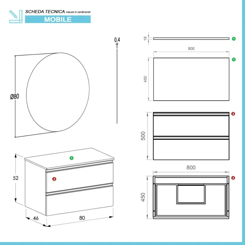 Il mobile sospeso prevede due cassetti frontali con meccanismo di chiusura Soft Close. E' fornito già montato ed include le staffe di fissaggio. incluso nella confezione c'è lo specchio.