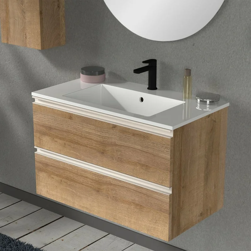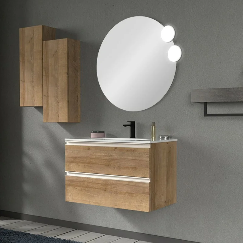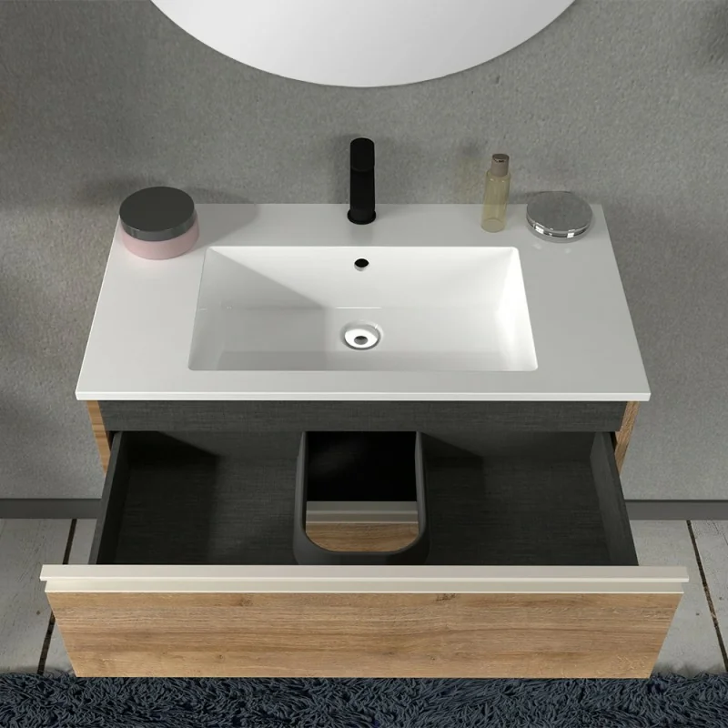 Mobile con lavabo ad incasso e specchio 80 cm,struttura con due cassetti soft-close e apertura a gola