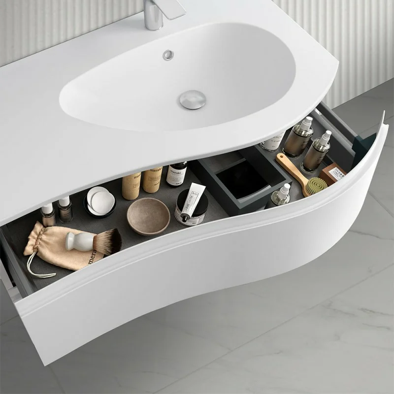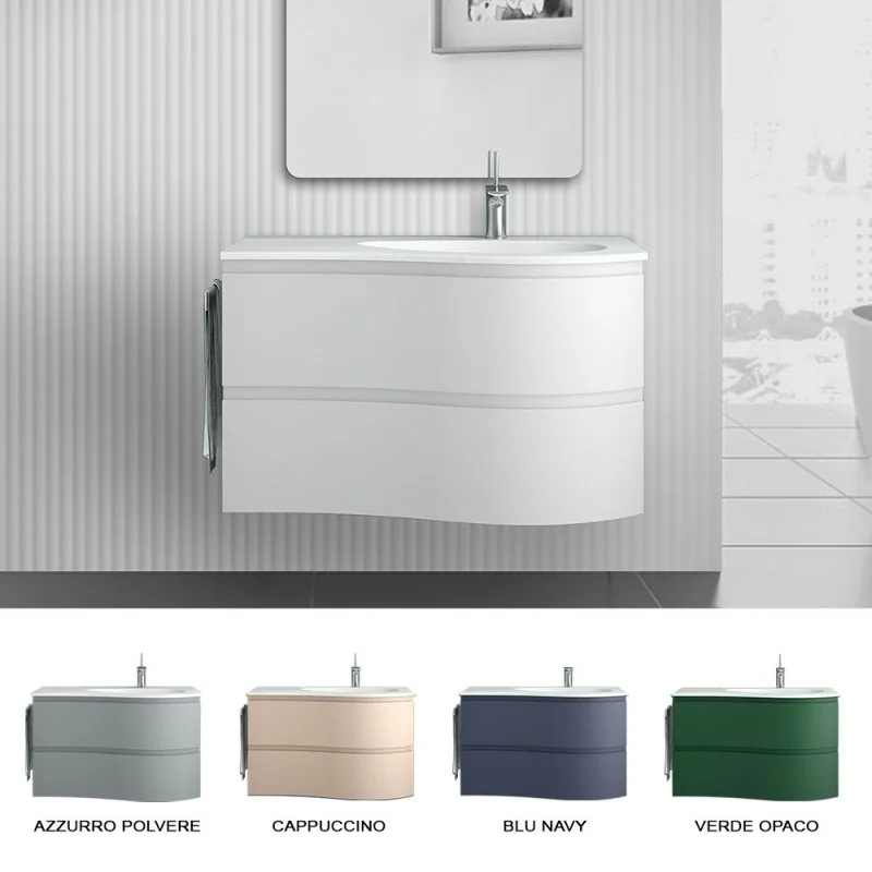 Il mobile vanta due ampi cassettoni con guida ad estrazione totale,chiusura soft-close,apertura a gola e finitura soft-touch,per un effetto opaco e vellutato al tatto. La base ospita un lavabo con ampio pozzetto decentrato ed elegante finitura bianco opaco;completa il set lo specchio con installazione reversibile.