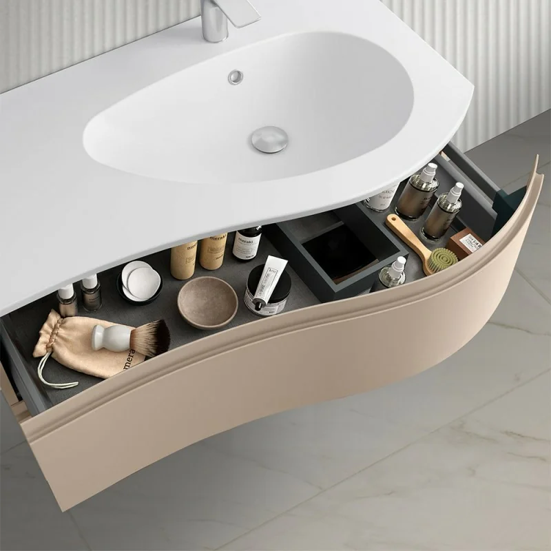Il mobile vanta due ampi cassettoni con guida ad estrazione totale,chiusura soft-close,apertura a gola e finitura soft-touch,per un effetto opaco e vellutato al tatto. La base ospita un lavabo con ampio pozzetto decentrato ed elegante finitura bianco opaco;completa il set lo specchio con installazione reversibile.