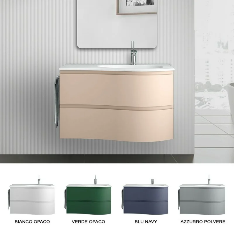 Melody è la soluzione d’arredo che meglio esalta qualsiasi stanza da bagno,composizioni sospese disponibili in diverse finiture e proposte con l’impiego di materiali di altissima qualità: mobile in legno MDF,lavabo in resina con vasca decentrata sia dx che sx e specchio con angoli stondati.