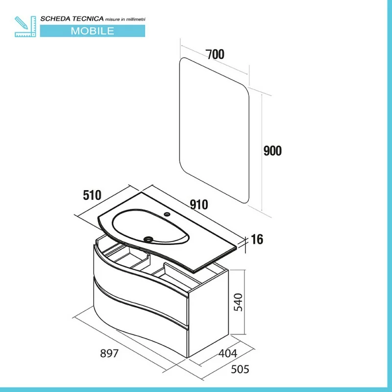 • Dimensioni lavabo:L 91 x p 51 cm;