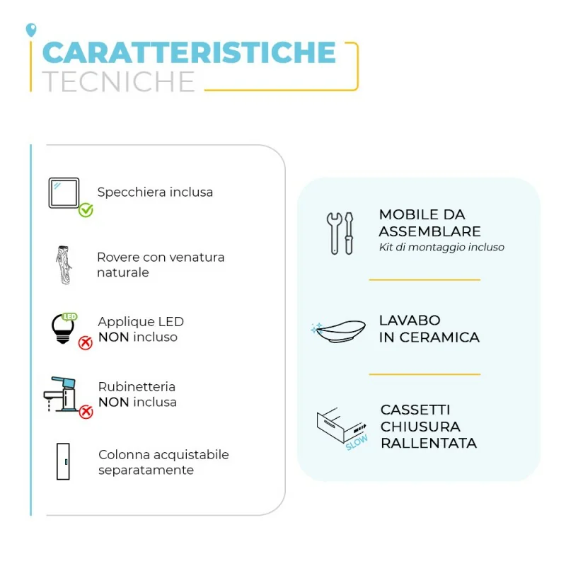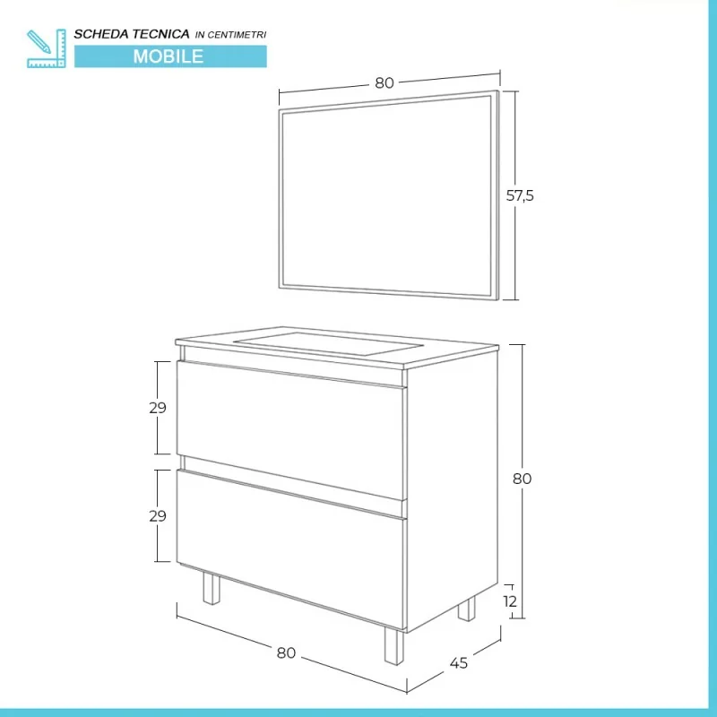 Scheda tecnica mobiletto bagno a terra 80 cm 2 cassetti serie Oasi rovere con specchio e lavabo Caratteristiche tecniche mobile bagno da appoggio 80 cm 2 cassetti serie Oasi rovere con specchio e lavabo