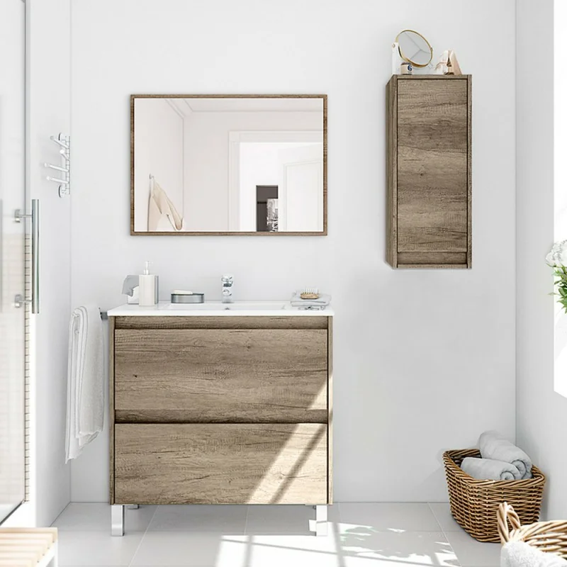 Mobile bagno a terra 80 cm in rovere naturale con 2 cassetti,lavabo in ceramica e specchiera su pannello