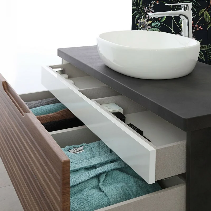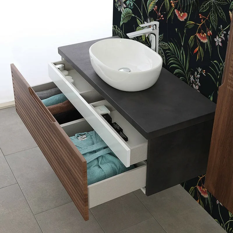 La composizione bagno sospesa Ravello è realizzata in mdf rivestita in pvc. La struttura in finitura ardesia e top spessore 4 cm. Il frontale del cassetto in noce canaletto riporta un elegante effetto dogato con maniglia integrata nel frontale,molto capiente nasconde al suo interno un piccolo cassetto a scomparsa con salvasifone,comodo per riporre gli oggetti più piccoli. Le chiusura dei cassetti è ammortizzata,così da evitare urti accidentali.