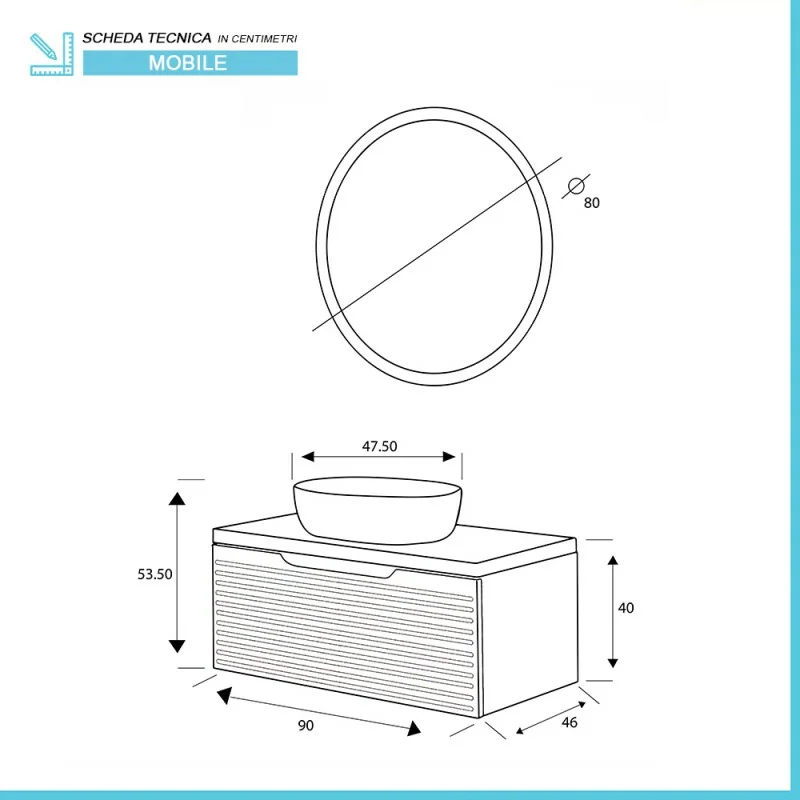 La composizione bagno sospesa si completa con un lavabo da appoggio in ceramica bianca e specchio tondo da 80 cm con cornice serigrafata.
