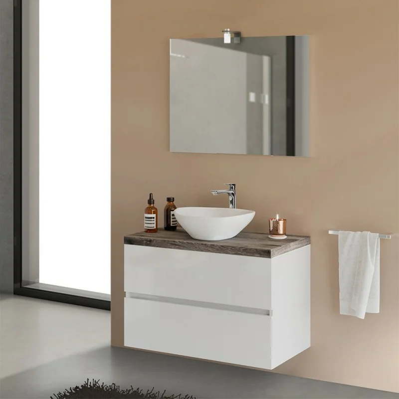 Mobile bagno sospeso – L 80 cm,base con due cassetti a chiusura rallentata,top rovere fossile e specchio 80x60 con lampada LED serie Town