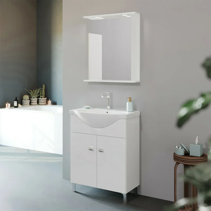 Mobile bagno a terra – L 65 cm in legno nobilitato bianco lucido a due ante,lavabo in ceramica e specchio con mensola ed illuminazione LED serie Creta