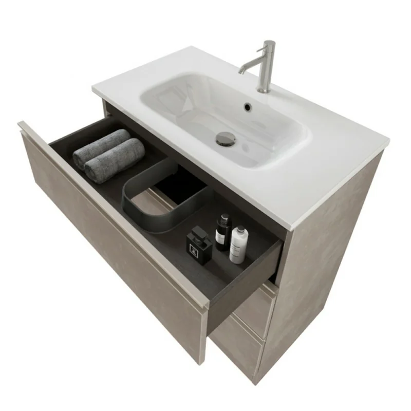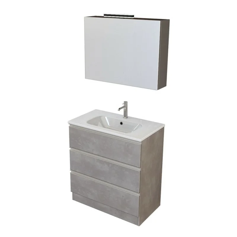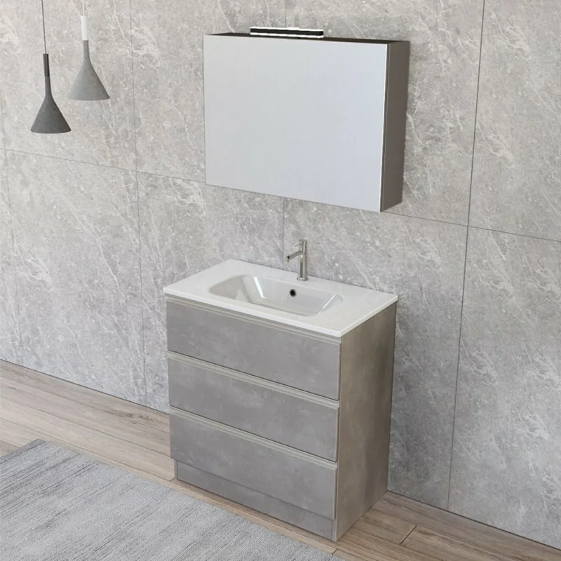 Mobile bagno a terra – Master 80 cm grigio cemento con 3 cassetti,lavabo e specchio contenitore