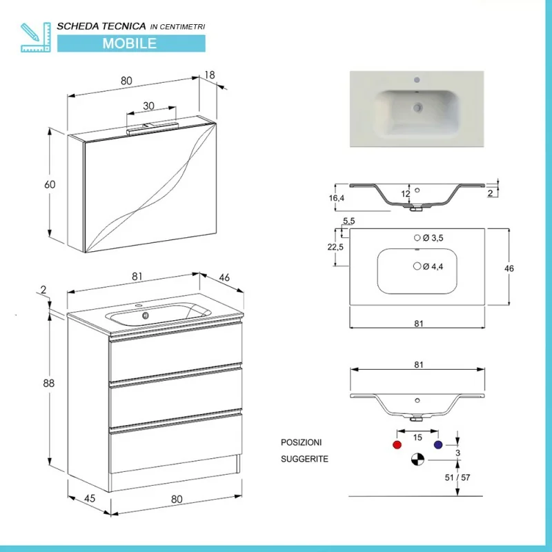 • Dimensioni lavabo:L 81 x p 46 x H 1.5 cm – Profondità vasca 12 cm - Peso 11 kg;