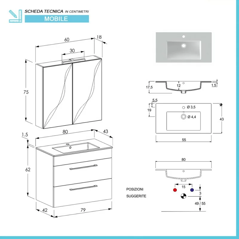 • Dimensioni lavabo in ceramica:L 80 x p 43 x H 1.5 cm – Profondità vasca 12 cm - Peso 13,5 kg;