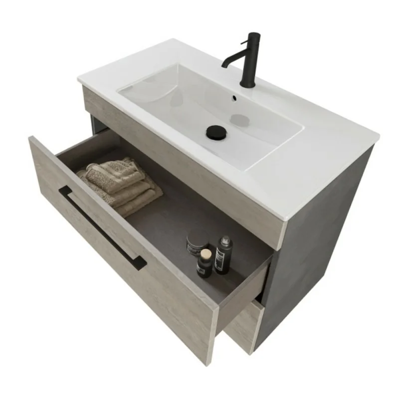 La base da 80 cm ospita 2 cassetti a chiusura ammortizzata soft close e apertura con maniglie in metallo nero opaco. Ai frontali colore grigio effetto legno si contrappongono i fianchi grigio lava per dare un effetto moderno all’arredamento. Il mobile viene fornito già montato ed il fissaggio a parete risulta facile e veloce:all'interno della confezione viene fornito un QR code con link ad un video illustrativo del processo di fissaggio.