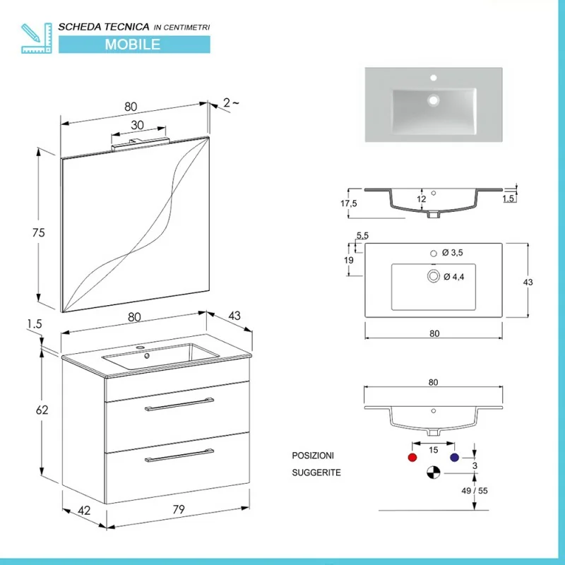• Dimensioni lavabo in ceramica:L 80 x p 43 x H 1.5 cm – Profondità vasca 12 cm - Peso 13,5 kg;