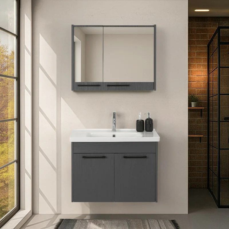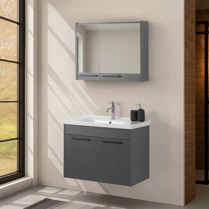 Mobile bagno sospeso 80 cm grigio effetto legno con armadietto a specchio Sofia