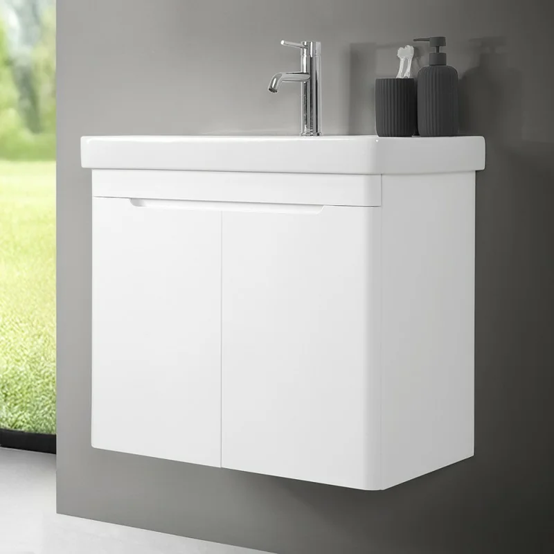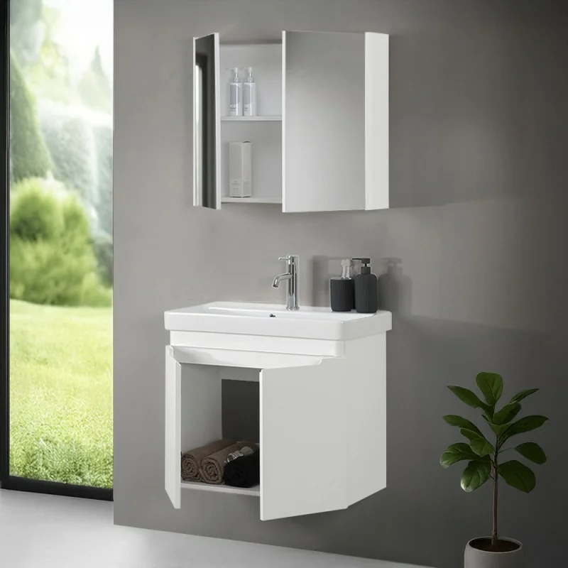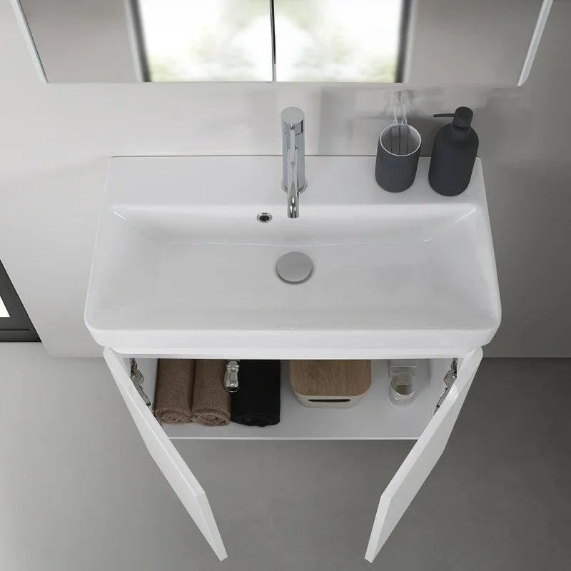 Mobile bagno sospeso 70 cm colore bianco lucido salvaspazio con ante, lavabo in ceramica e specchio contenitore Linea Clip