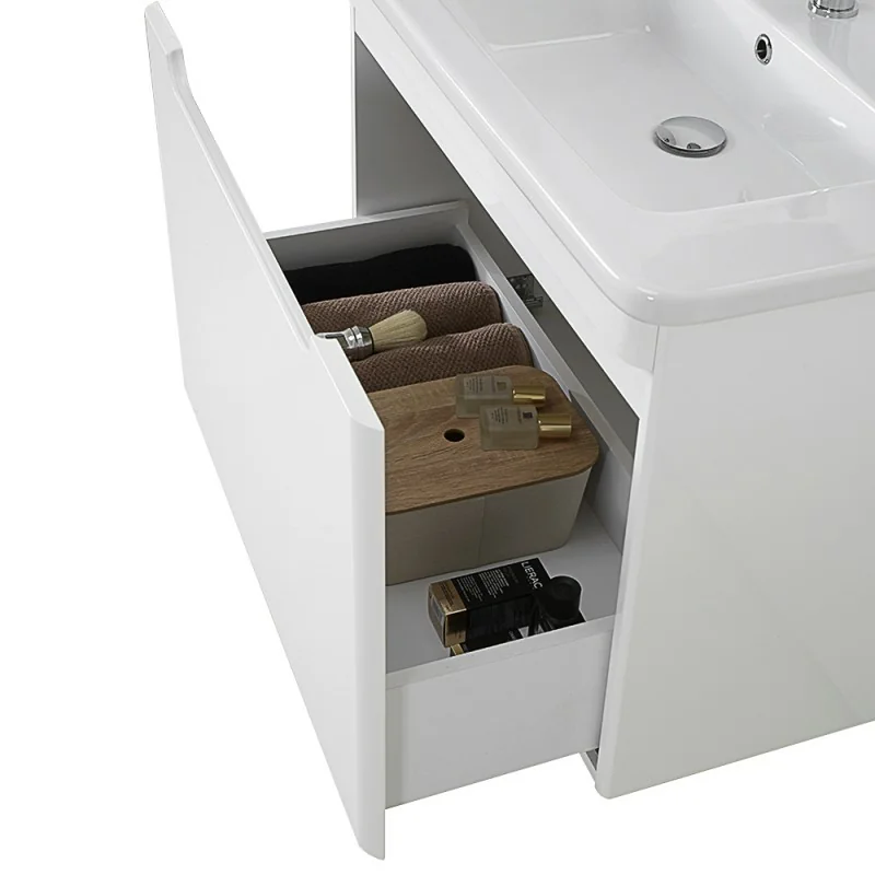La base sospesa è realizzata in legno nobilitato in colore bianco lucido. Ha inoltre un cassettone con maniglia a gola integrata a chiusura ammortizzata soft-close,che evita rotture e danni dovuti a chiusure violente del cassetto. Il mobile da bagno sospeso si completa con un lavabo integrato in ceramica ed uno specchio a filo lucido di dimensioni 70x90 cm. Questa composizione sospesa arriverà a casa tua già montata,ti basterà solo fissare il tutto a parete.