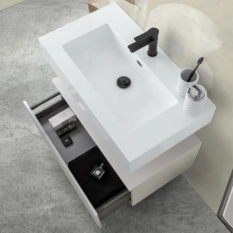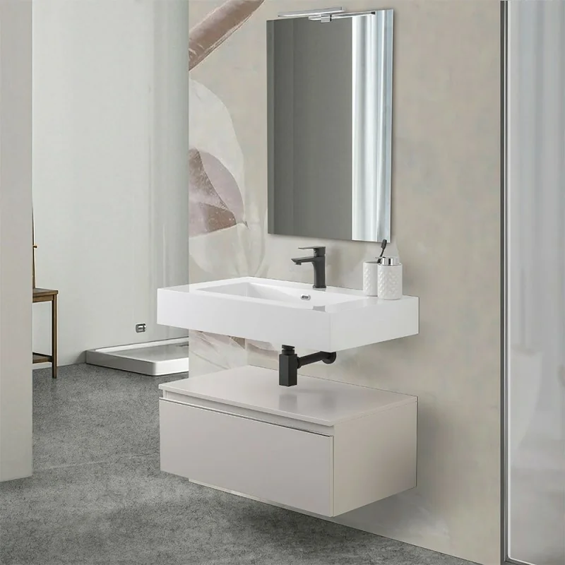 La composizione bagno è formata da un cassettone sospeso da 80 cm con chiusura ammortizzata soft-close,uno specchio 60x80 con installazione reversibile ed un lavabo sospeso in resina della linea Lodi.