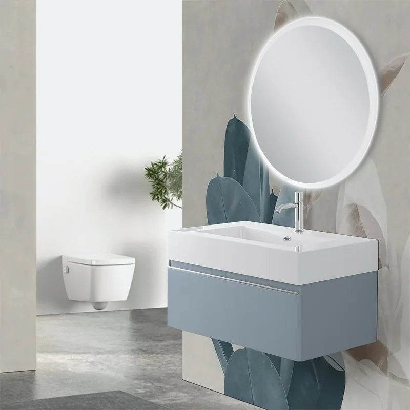 Mobile bagno con cassettone chiusura soft-close,lavabo in resina 80 cm e specchio tondo retroilluminato
