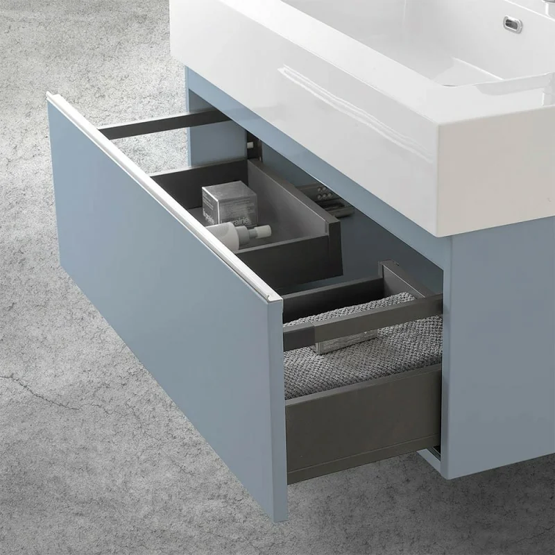 La composizione bagno è composta da un cassettone sospeso da 80 cm con morbida chiusura ammortizzata soft-close per evitare improvvise chiusure e impatti rumorosi e comoda maniglia a gola piatta che consente di impugnare direttamente l’anta.
