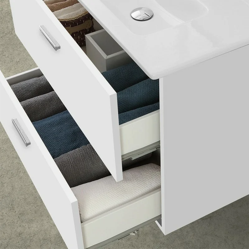La composizione bagno proposta è in bianco lucido, composta da un mobile bagno sospeso con doppio cassettone,con chiusura soft-close e maniglia in finitura cromo;completano l'arredo bagno un pensile sospeso con quattro scomparti interni e ripiani fissi,un lavabo in ceramica con foro troppopieno,uno specchio a filo con installazione reversibile e lampada a LED.