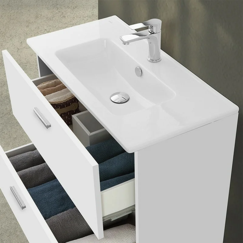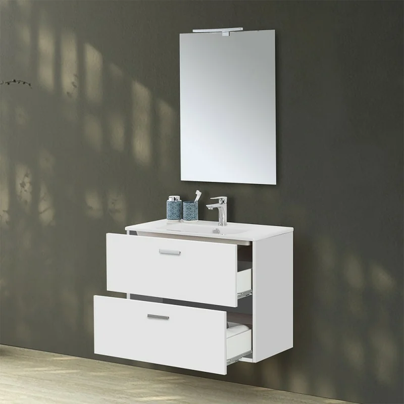 La composizione proposta comprende un mobile bagno sospeso,in bianco lucido multifunzionale e spazioso,con due cassettoni con chiusura soft-close e pratiche maniglie cromo lucido;completano la composizione un lavabo da incasso in ceramica con foro troppopieno,uno specchio a filo con installazione reversibile e lampada a LED.