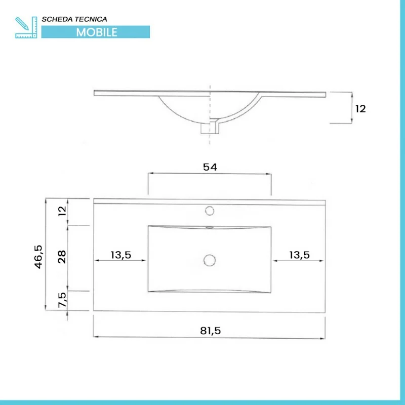 • Dimensioni lavabo ceramica:H 12 x L 81,5 x p 46,5 cm;