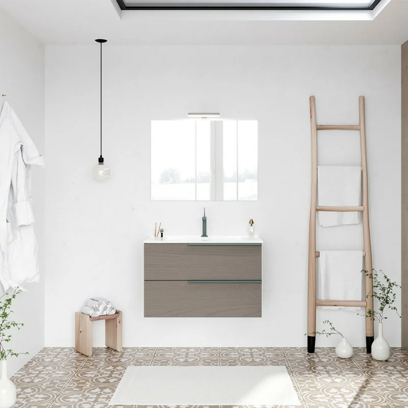 Mobile bagno sospeso 80 fango con lavabo in ceramica e specchio a filo LED | Victoria