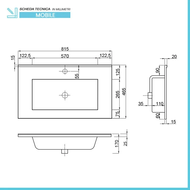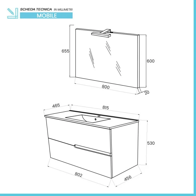 • Dimensioni lavabo:L 81,5 x p 46,5 cm;