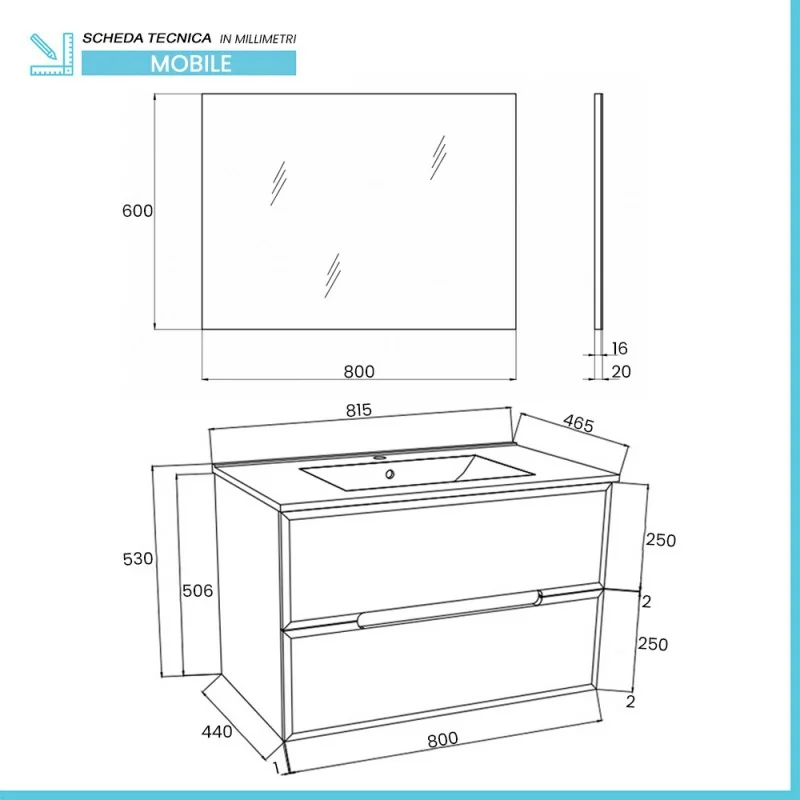 • Dimensioni specchio:L 80 x p 2 x H 60 cm;