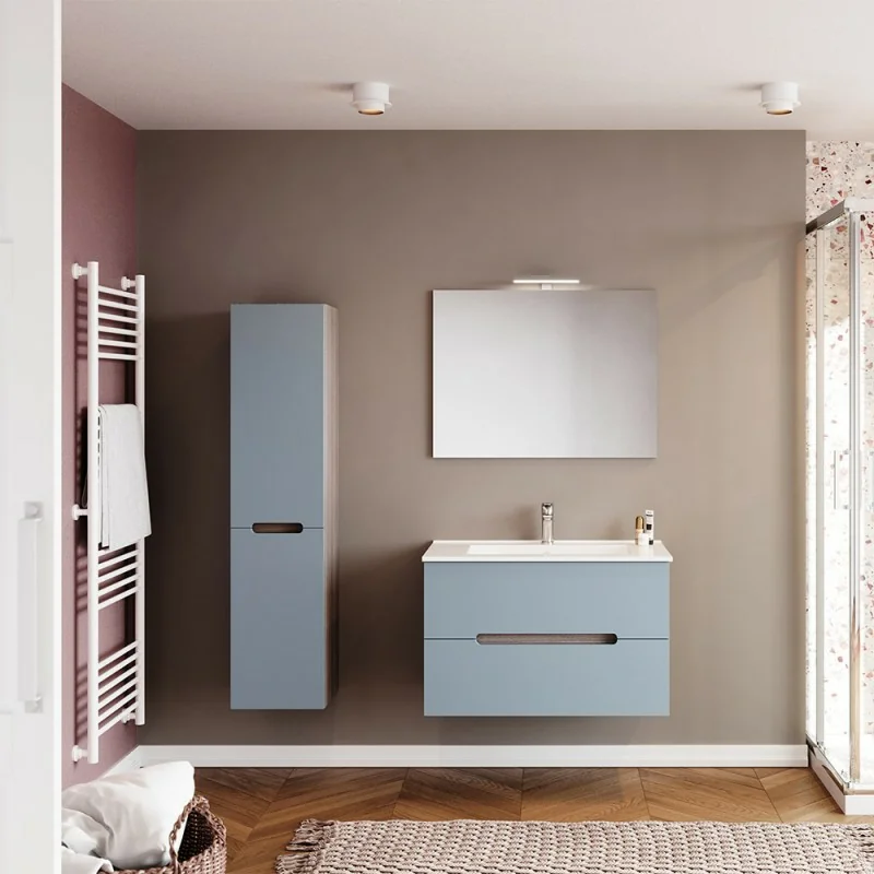 Mobile bagno sospeso 80 rovere fumo e blu pastello con lavabo e specchio | Iris
