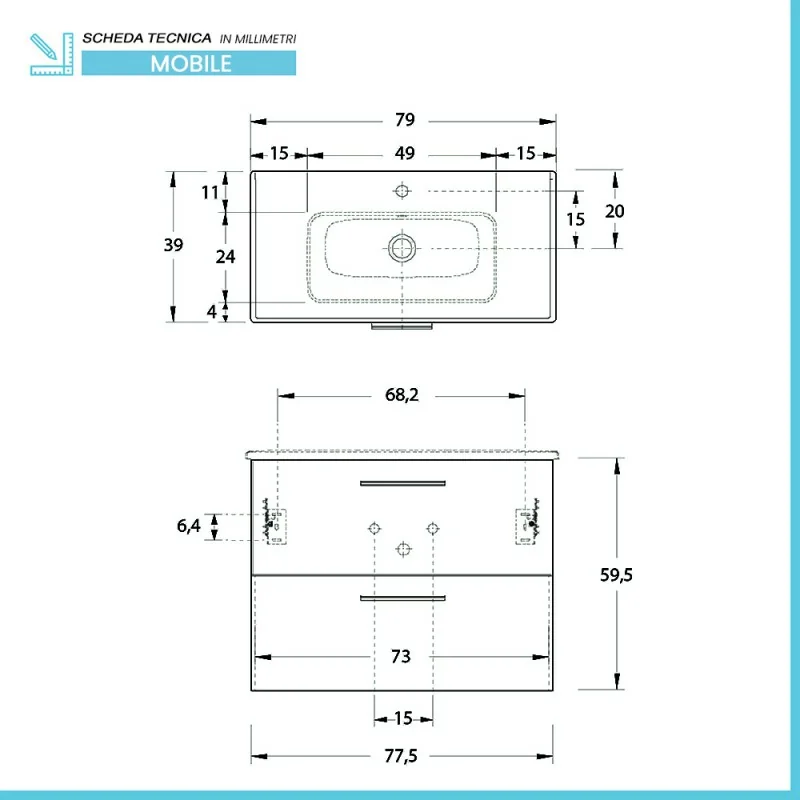 • Dimensioni lavabo:L 79 x p 39,5 cm,in ceramica;