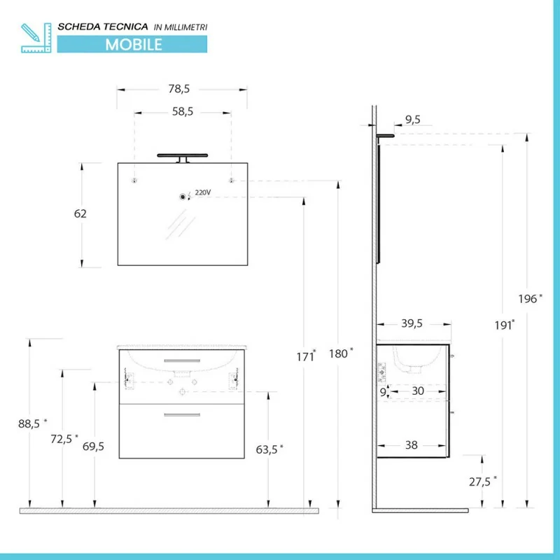 • Dimensioni mobile:L 79 x p 39 x H 59,5 cm;