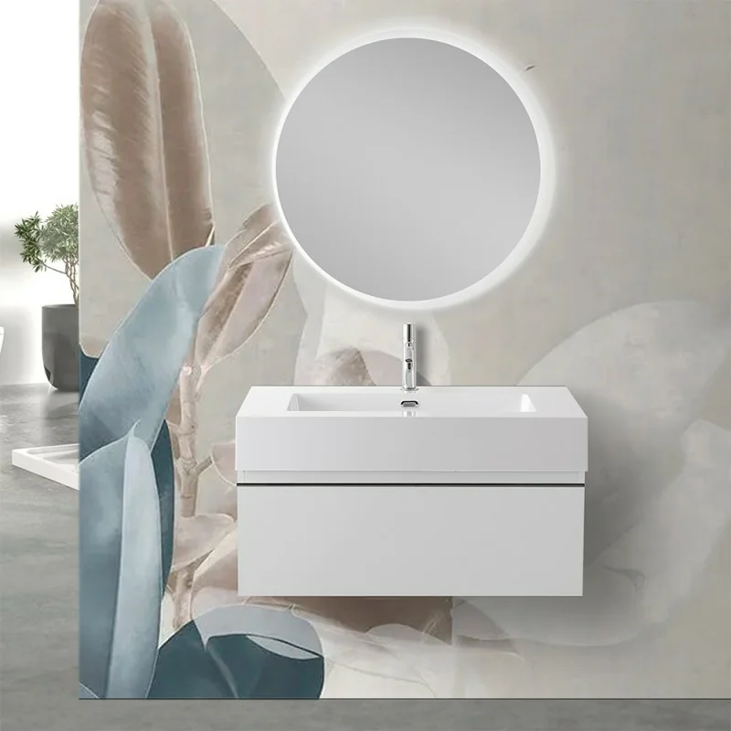 Mobile bagno in legno MDF con cassetto soft-close,lavabo 80 cm Lodi e specchio tondo retroilluminato
