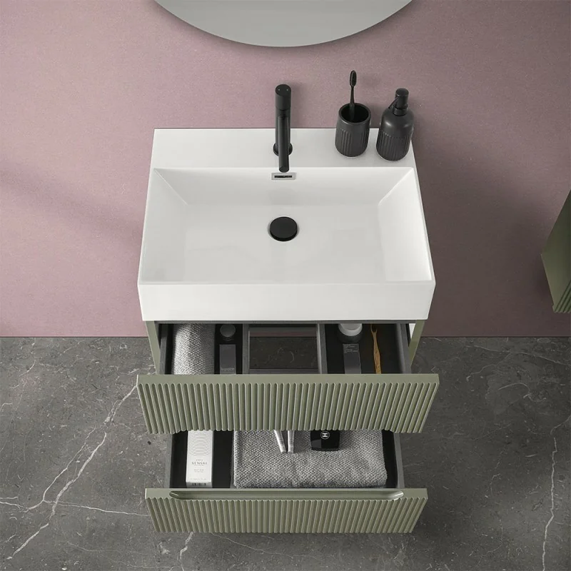Il mobile è dotato di due cassetti con chiusura soft-close,apertura a gola e alloggio salva sifone. È disponibile di diverse misure e finiture,anche con lavabo in ceramica o con top e lavabo d’appoggio e pensile abbinato.